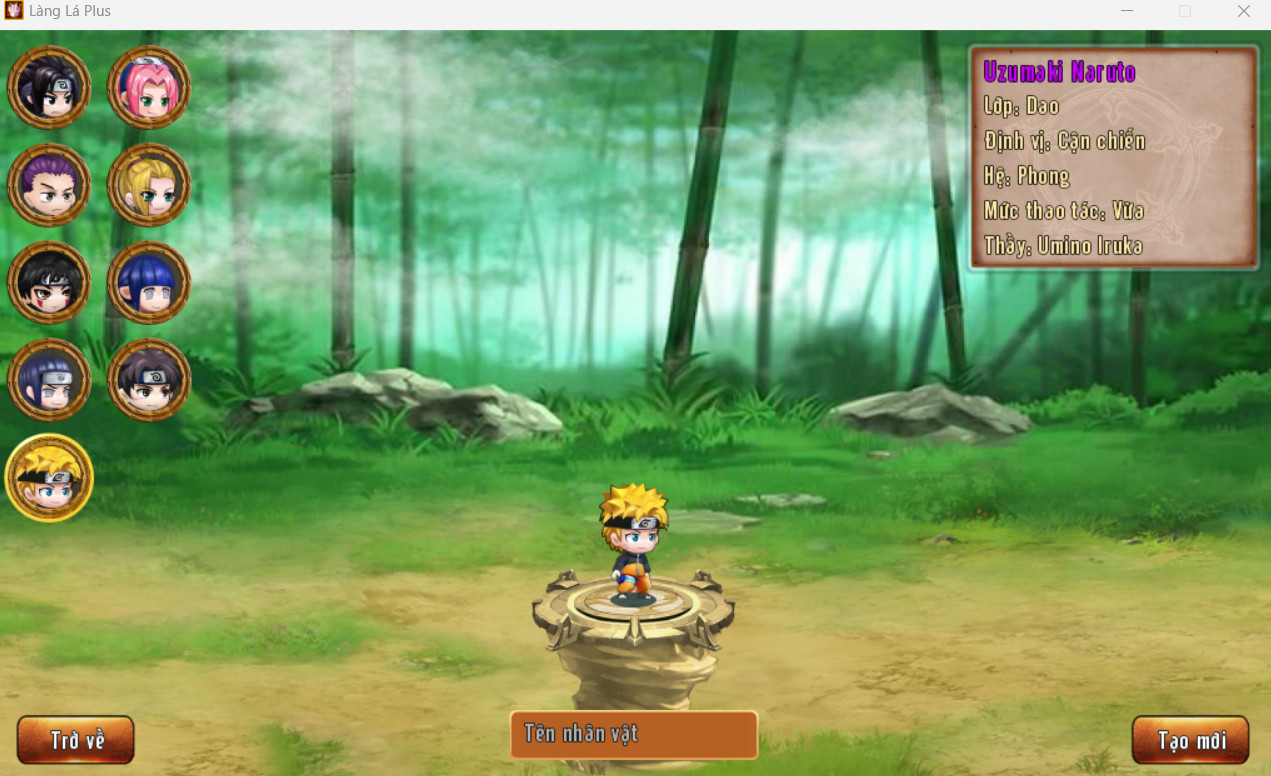 Làng Lá là nơi sinh sống của nhiều ninja tài ba, trong đó có 9 nhân vật chính vô cùng quen thuộc mà bạn có thể nhập vai bất kì vào những người này. Đó là: Naruto, Sasuke, Sakura, Hinata, Ino, Kiba, Shikamaru, Neji và Tenten.